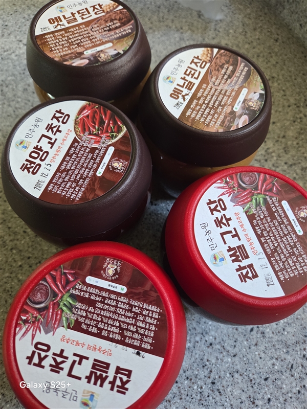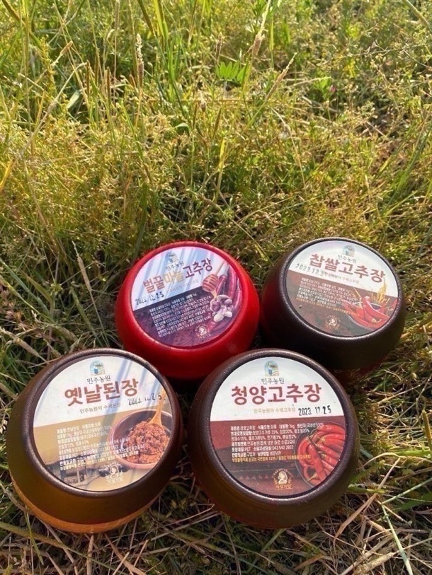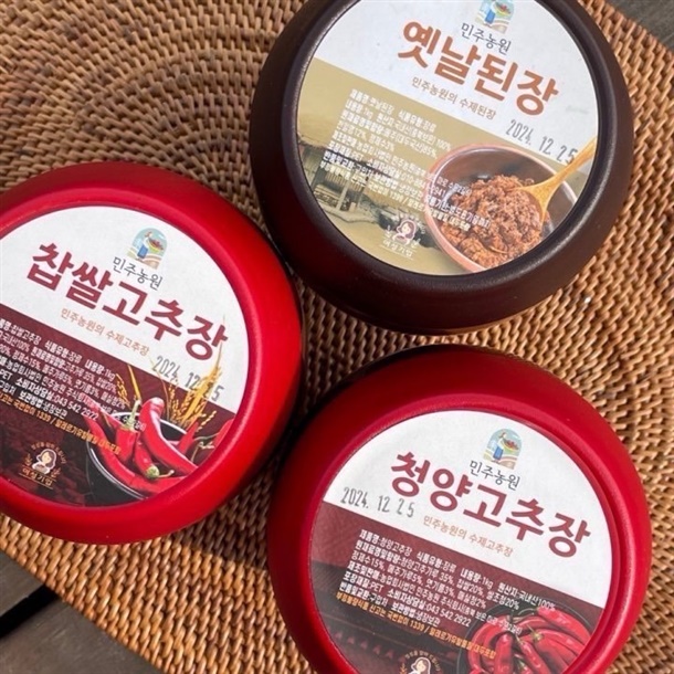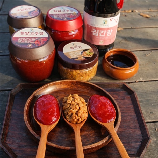 | 1-5. 원재료명 및 함량(농수산물의 원산지 표시에 관한 법률에 따른 원산지 표시 포함) | 찹쌀고추장 -고춧가루35%,찹쌀20%,쌀조청20%,정제수15%,메주가루5%,엿기름3%,매실청2% / 청양고추장- 청양고춧가루35%,찹쌀20%,쌀조청20%,정제수15%,메주가루5%,엿기름3%,매실청2% / 옛날된장- 국내산(충북보은)100%,메주(대두국산)85%,천일염12%,정제수3% / 집간장- 메주(국산)35%,천일염(국산)11%,정제수54%,/청국장- 대두(국산)90%,정제수5%,천일염(국산)4%,고춧가루(국산)1% |