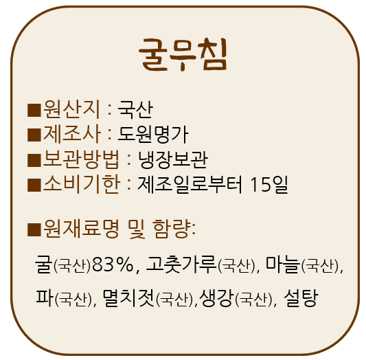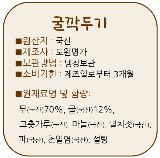 | 1-4. 포장단위별 용량(중량), 수량 | 굴깍두기 1kg, 굴무침 1통(500g), 굴무침 1통(800g) |