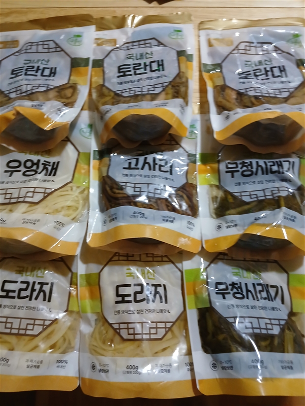 | 1-4. 포장단위별 용량(중량), 수량 | 무청시래기 400g,고구마줄기 400g,토란줄기 400g,,고사리 400g,도라지 400g,연근채 400g,우엉채 600g |