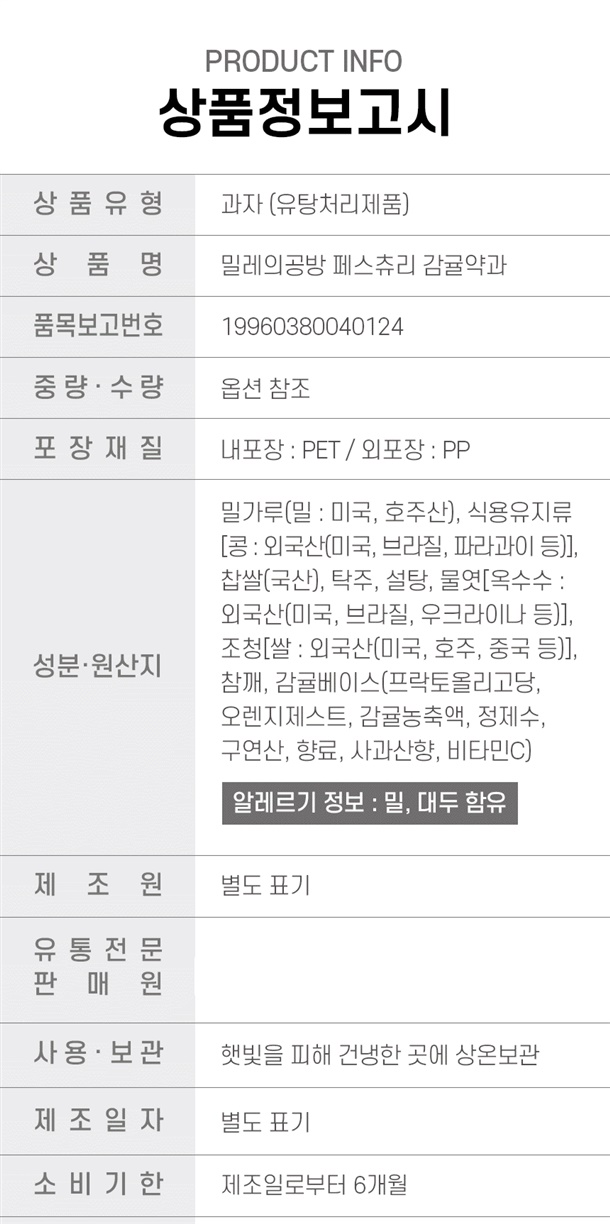 | 1. 식품위생법에 따른 표시사항 | 본 제품은 소비자 공정거래 위원회 고시 소비자 분쟁 해결기준에 의거 교환 또는 환불 받으실 수 있습니다. 부정·불량식품 신고는 국번없이 1399 |