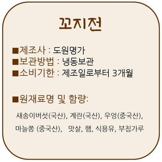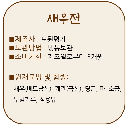 | 3. 농수산물의 원산지 표시에 관한 법률에 따른 원산지 | 상품상제정보 참고 -새우(베트남산), 동태포(러시아산) ,우엉.마늘쫑(중국산) 나머지 국산 |