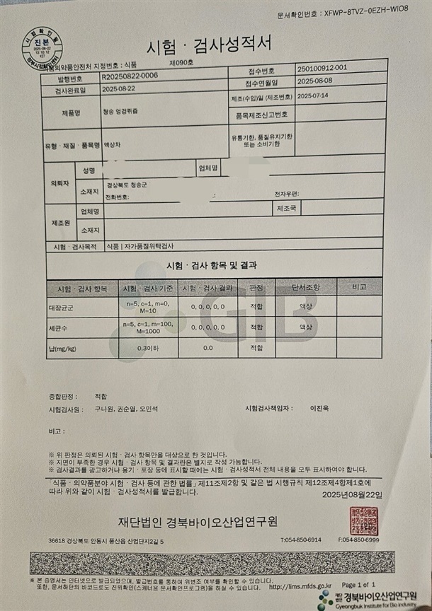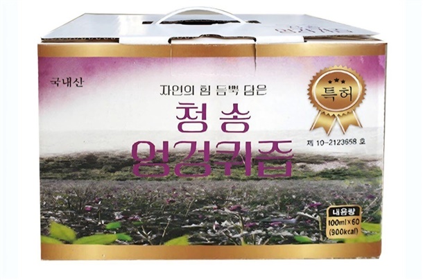 | 1-5. 원재료명 및 함량(농수산물의 원산지 표시에 관한 법률에 따른 원산지 표시 포함) | 엉겅퀴즙:말린엉겅퀴50%정재수50%/특허 엉겅퀴즙:말린엉겅퀴49.8%우슬28.5%두충14.2%대추7.1%감초0.4% |