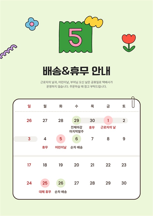 · 배송은 입금확인된 날짜로부터 1~3일 소요되며 최대 7일 이내 출고됩니다. (공휴일, 기상악화 등 불가피한 상황에 따라 추가 지연될 수 있습니다.)