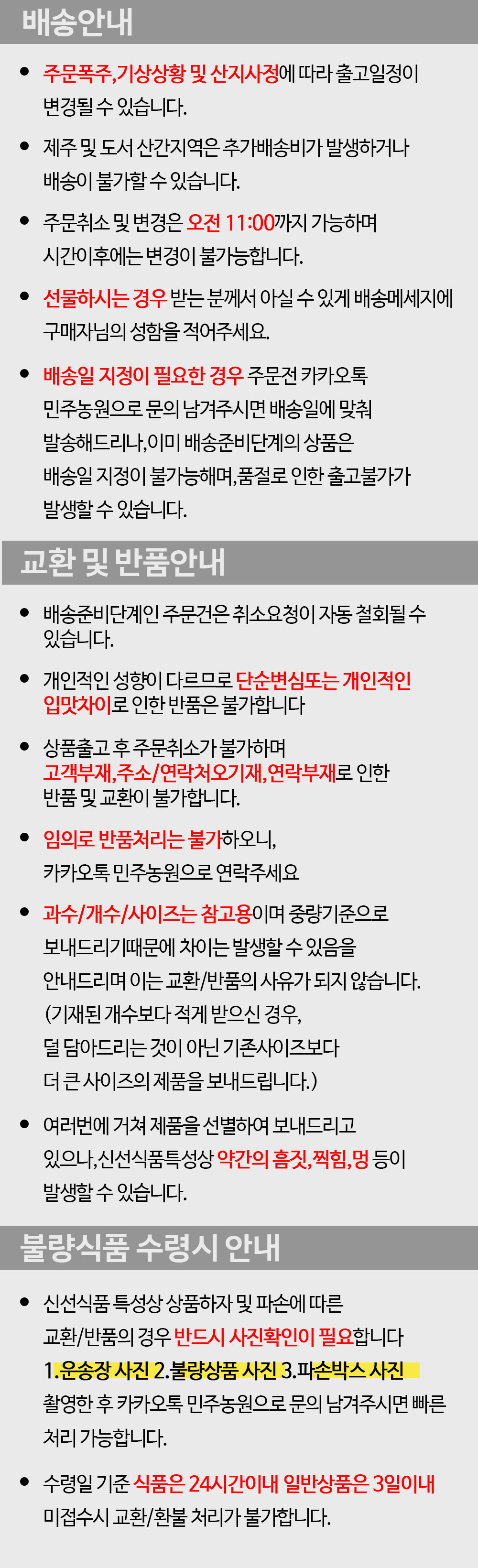 | 4. 제조연월일(포장일 또는 생산연도), 유통기한 또는 품질유지기한 | 신선식품 특성상 별도의 유통기한은 없으나 빠른 섭취를 권장드립니다. |