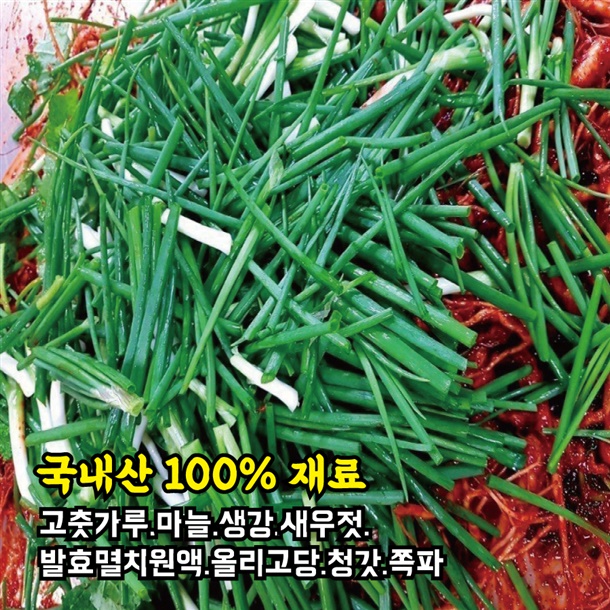 | 1-5. 원재료명 및 함량(농수산물의 원산지 표시에 관한 법률에 따른 원산지 표시 포함) | 고춧가루,마늘,생강,새우젓,발효멸치원액,올리고당,청갓,쪽파-모두 국내산 |