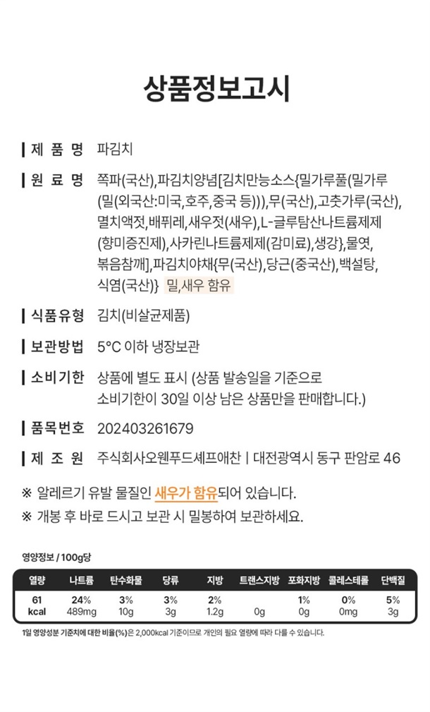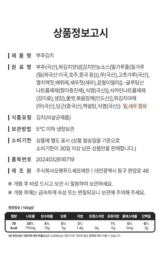 | 1. 식품위생법에 따른 표시사항 | 본 제품은 소비자 공정거래 위원회 고시 소비자 분쟁 해결기준에 의거 교환 또는 환불 받으실 수 있습니다. 부정·불량식품 신고는 국번없이 1399 |