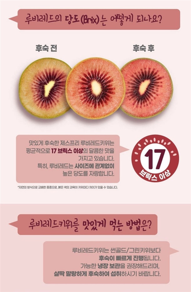| 1. 포장단위별 용량(중량), 수량, 크기 | 루비레드키위 대과 15개입 (1.8kg내외),30개입 (3.6kg내외) |