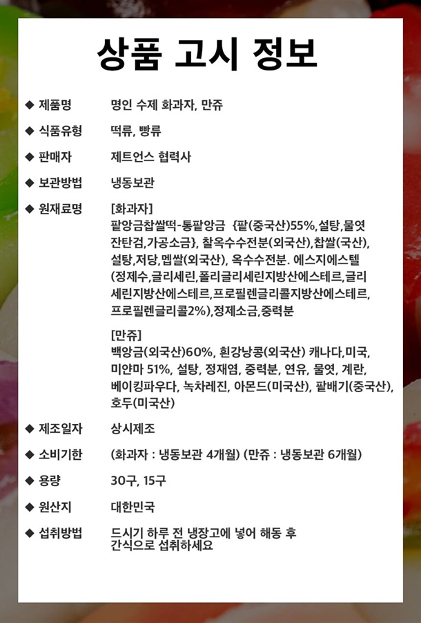 | 1-3. 제조연월일, 유통기한 또는 품질유지기한 | 화과자:4개월 / 만쥬:6개월 |