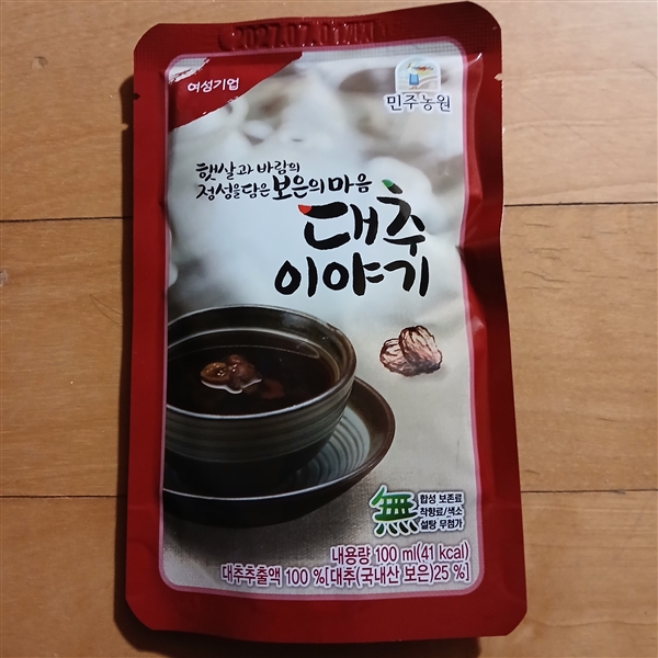 | 1-5. 원재료명 및 함량(농수산물의 원산지 표시에 관한 법률에 따른 원산지 표시 포함) | 대추추출액 100%(대추25%[국산:보은],정제수) |