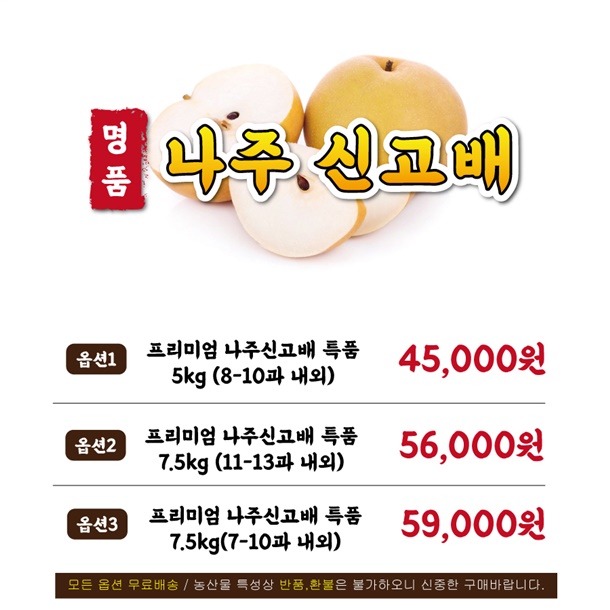 | 1. 포장단위별 용량(중량), 수량, 크기 | 나주 신고배 5kg , 7.5kg |