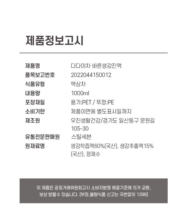 | 식품위생법에 따른 표시사항 | 본 제품은 소비자 공정거래 위원회 고시 소비자 분쟁 해결기준에 의거 교환 또는 환불 받으실 수 있습니다. 부정·불량식품 신고는 국번없이 1399 |