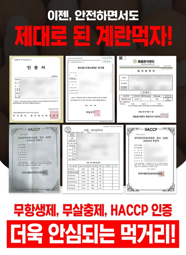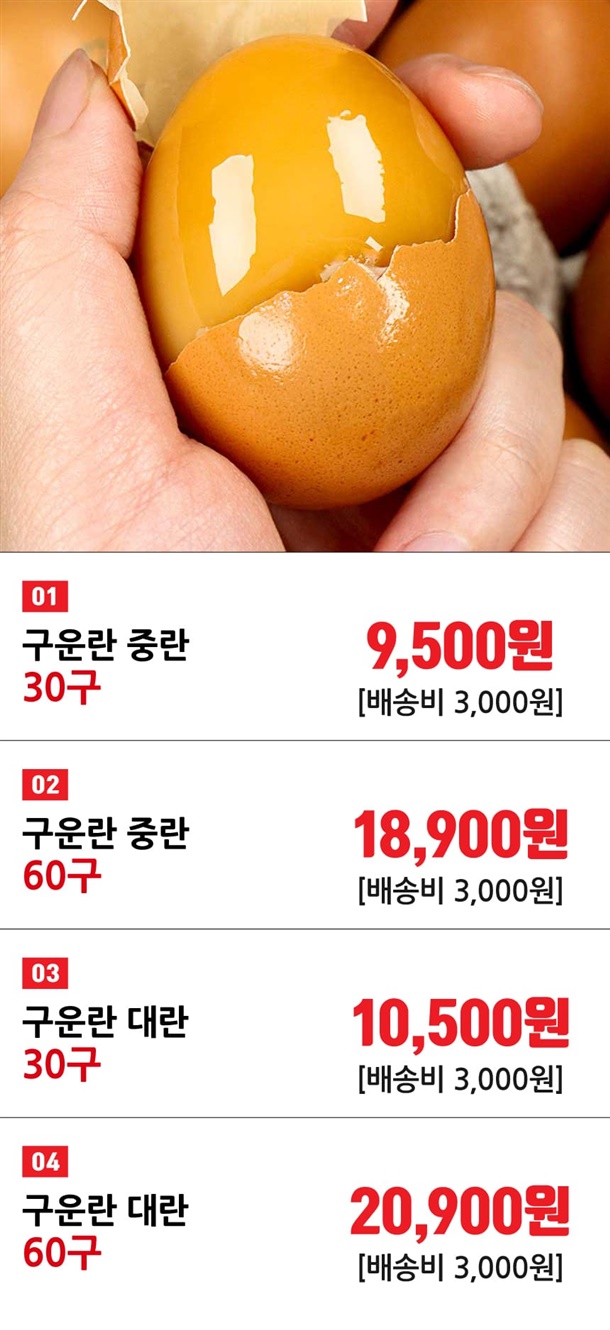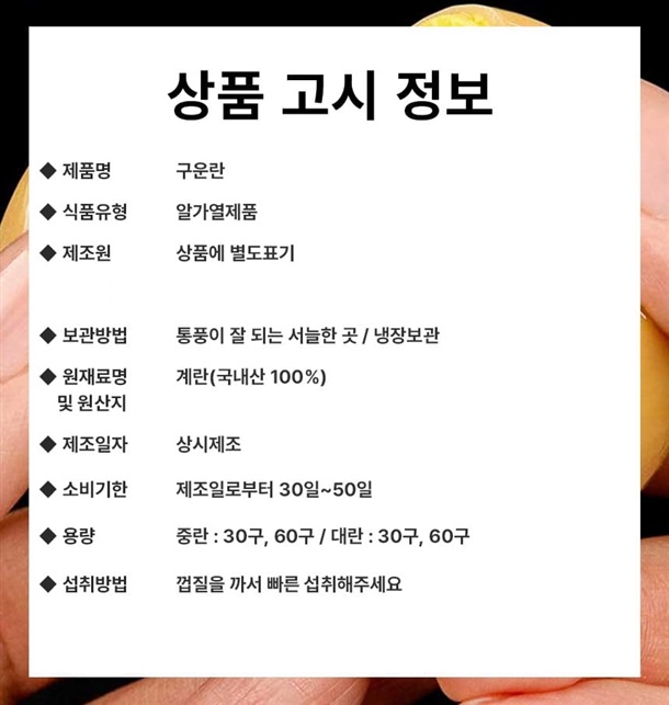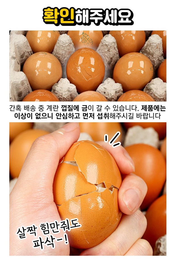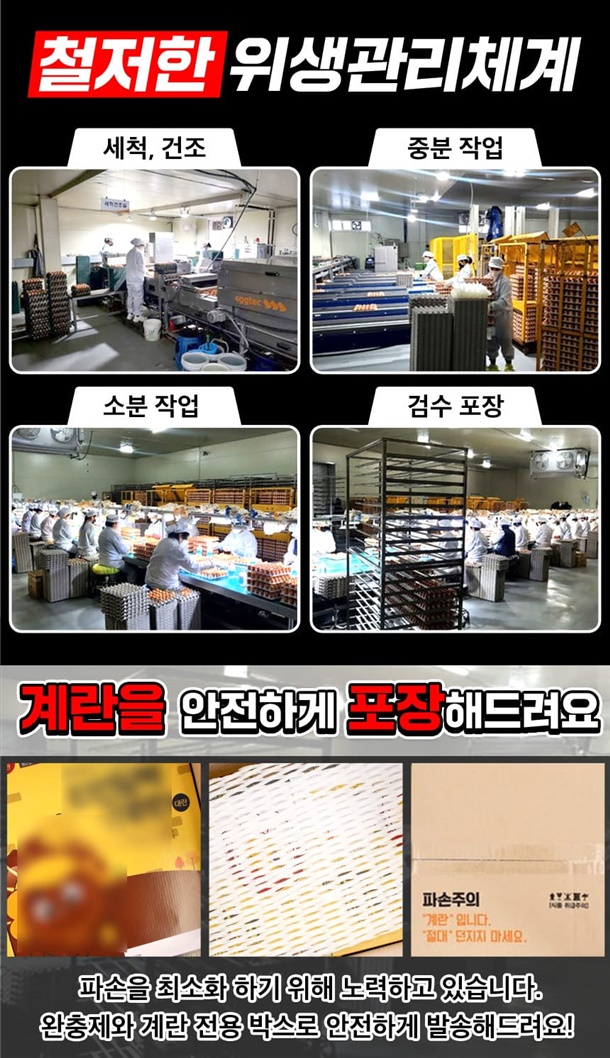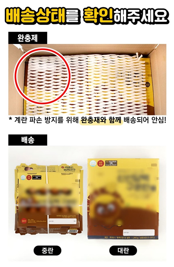 | 1. 포장단위별 용량(중량), 수량, 크기 | 중란 : 30구, 60구 / 대란 : 30구, 60구 |