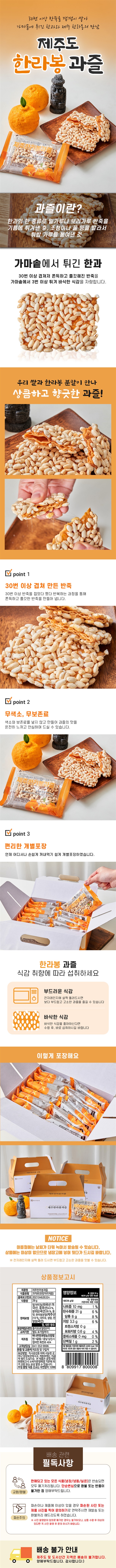 | 원재료명 및 함량(농수산물의 원산지 표시에 관한 법률에 따른 원산지 표시 포함) | 쌀튀밥(국산)26%, 한라봉분말(제주산)10%, 밀가루(수입산:미국산, 호주산)43%, 물엿, 설탕, 천일염(국산), 대두유 -대두, 밀 함유 |