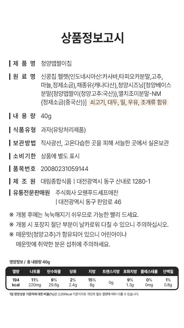 | 1-5. 원재료명 및 함량(농수산물의 원산지 표시에 관한 법률에 따른 원산지 표시 포함) | 상품상세정보 참고 |