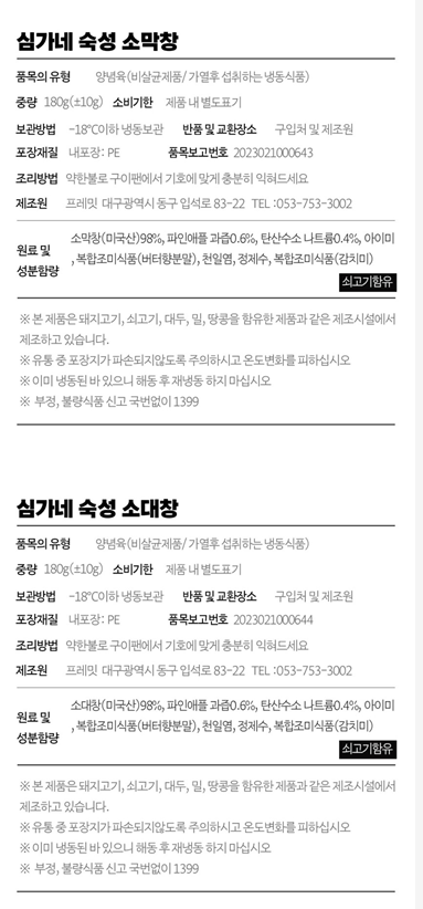 | 식품위생법에 따른 표시사항 | 본 제품은 소비자 공정거래 위원회 고시 소비자 분쟁 해결기준에 의거 교환 또는 환불 받으실 수 있습니다. 부정·불량식품 신고는 국번없이 1399 |