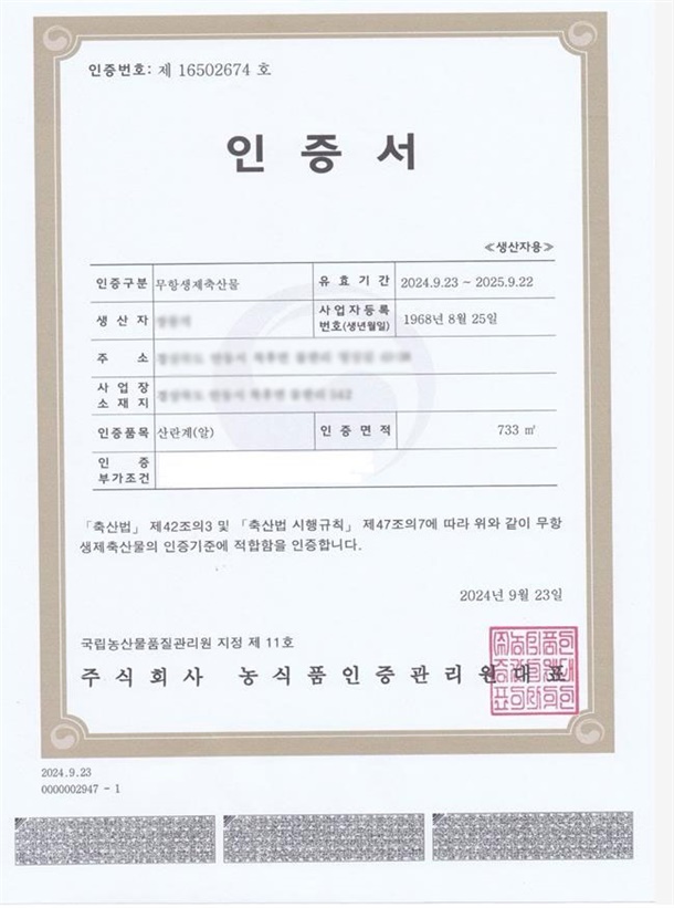 | 생산자 및 소재지(수입품의 경우 생산자, 수입자 및 제조국) | 장봉석/경상북도 안동시 북후면 물한리 542 |