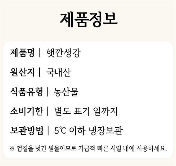 | 4. 제조연월일(포장일 또는 생산연도), 유통기한 또는 품질유지기한 | 신선식품 특성상 별도의 유통기한은 없으나 빠른 섭취를 권장드립니다. |