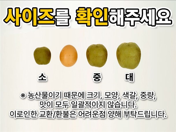 | 1. 포장단위별 용량(중량), 수량, 크기 | 소 : 500g(6~7과 내외), 1kg(12~14과 내외), 1.5kg(18~21과 내외) 중 : 1kg(10~12과 내외), 1.5kg(15~18과 내외) 대 : 1kg(8~9과 내외), 1.5kg (12~14과 내외) ※ 박스무게 포함이 아닌 실중량 |