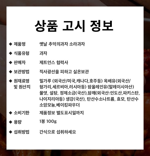 | 1. 식품위생법에 따른 표시사항 | 본 제품은 소비자 공정거래 위원회 고시 소비자 분쟁 해결기준에 의거 교환 또는 환불 받으실 수 있습니다. 부정·불량식품 신고는 국번없이 1399 |